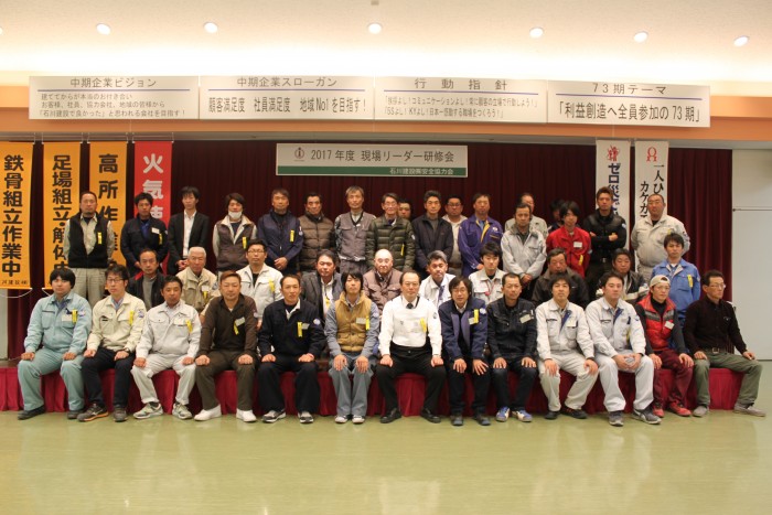 平成29年11月18日 石川建設本社7階大ホールに於いて、「2017年度 石川建設㈱ 現場リーダー研修会」が行われました。安全協力会会長の横山会長・総括安全衛生管理者の栗原専務の挨拶のあと、社内パトロールの報告を行い、労働災害発生状況・現場の危険有害要因の実態説明をし、栗原専務より安全指示がなされました。安全ビデオを見た後、テーブル毎にチームを作成し、指差し呼称・タッチアンドコール・健康問いかけKY演練をし、現場写真を使い危険発見テストを行いました。その後、リスクアセスメントKYの実技研修を行いました。最後に全員で指差し呼称をして終了となりました。